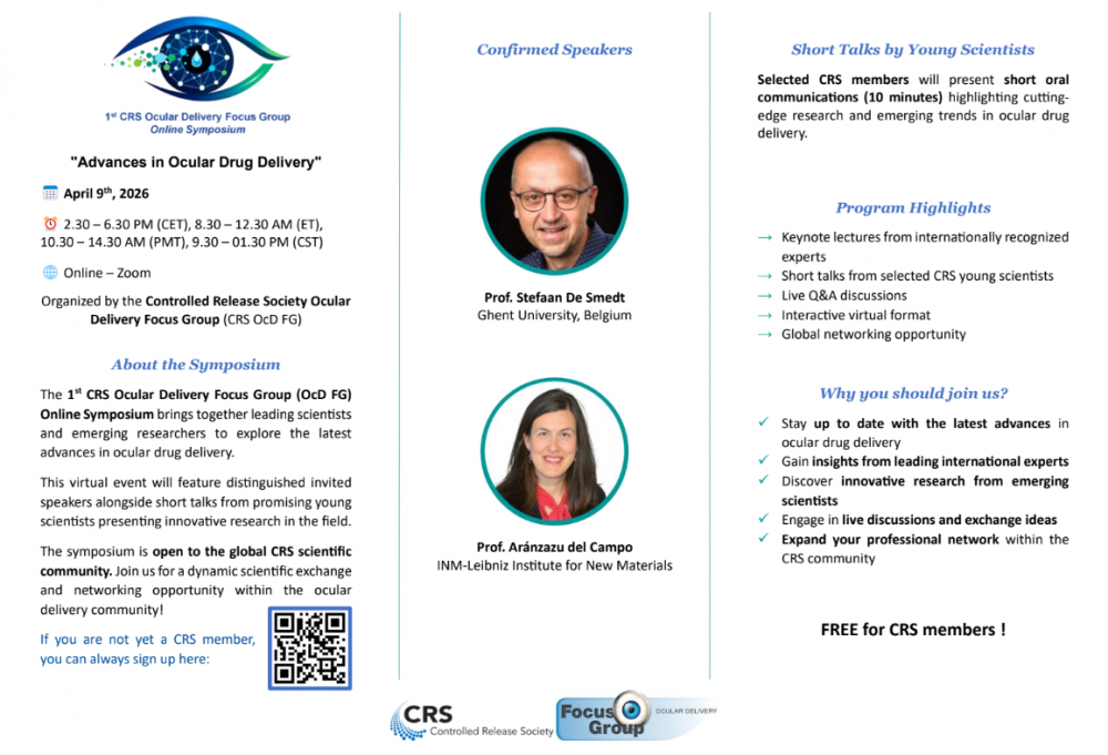 Theย 1st CRS Ocular Delivery Focus Group (OcD FG) Online Symposiumย will bring together researchers from academia, industry, and clinical practice to discuss the latest advances in ocular drug delivery. The event will highlight innovative technologies and emerging therapeutic strategies aimed at overcoming the unique challenges of delivering drugs to the eye. Through invited presentations and selected abstracts, the symposium will provide a platform for knowledge exchange and collaboration within the global ocular drug delivery community.